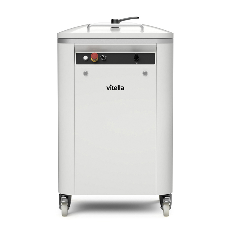 Machine à manipulation hydraulique, avec un cylindre pour la phase de pressage. Tableau de commande avec possibilité de régler le temps de pressage. Bouton pour le nettoyage de la cuve. Possibilité de mémoriser jusqu’à 9 programmes différents.